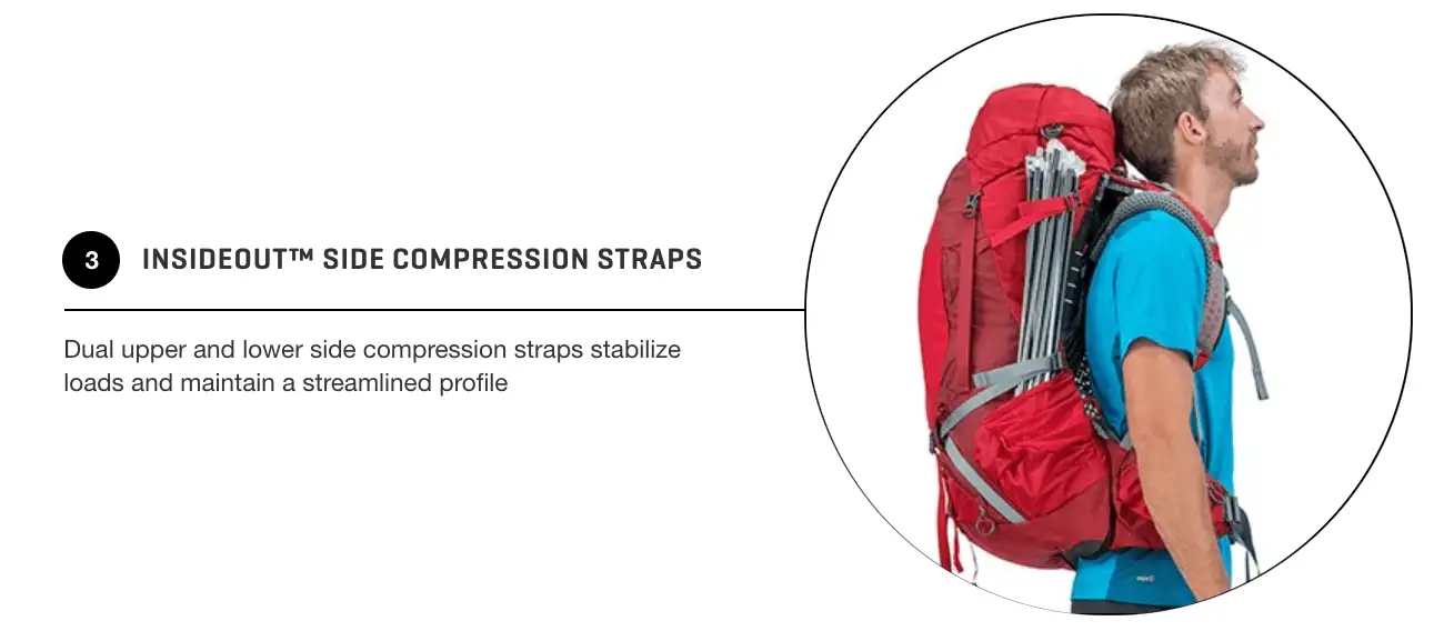 Tali kompresi ganda Osprey berarti Anda dapat mengompres tas Anda lebih mudah dari sebelumnya. Tali kompresi samping letakkan sebagian muatan dan biarkan Anda membawa barang di luar.